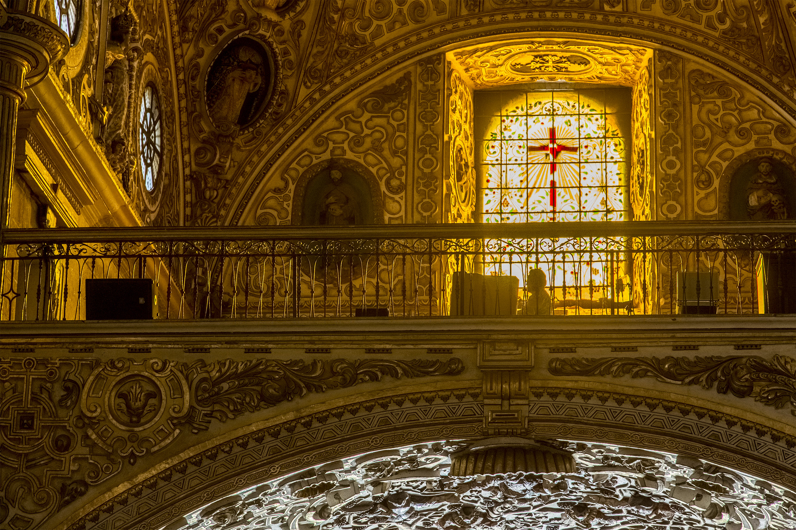 An organist plays in the rear balcony of a Catholic church in Oaxaca, Mexico. Three bracketed photos (normal, over and under exposed about 2 stops), taken in July 2012, were combined using the new “Merge to HDR” function in Adobe Camera Raw 9.0.