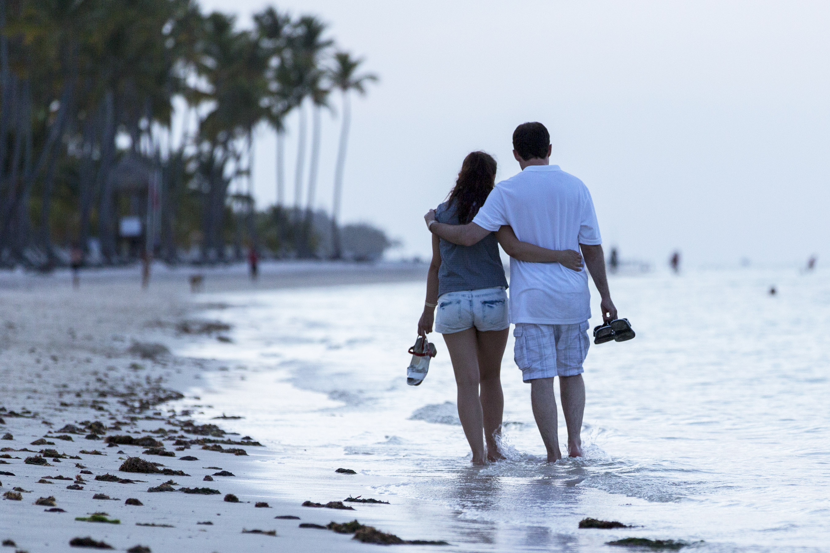 A couple walks arm in arm along the shore at Bavaro Beach in Punta Cana, Dominican Republic